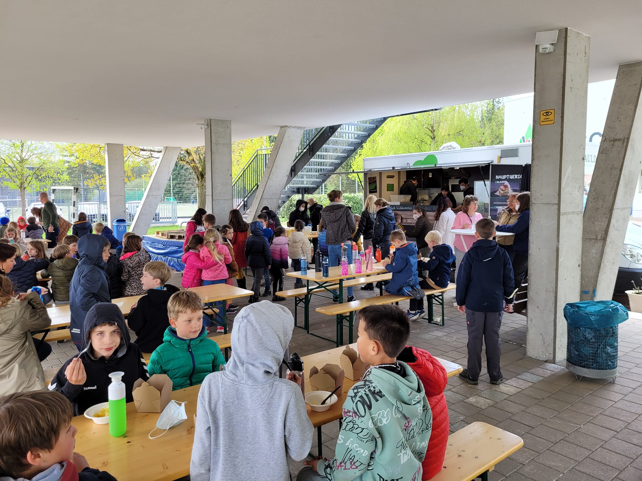 Um die Abiturientinnen und Abiturienten während der Prüfung nicht durch Lärm aus der Mensa zu stören, ist heute ein Maultaschen-Truck auf dem Schulhof im Einsatz. Es schmeckt und macht Spaß.
