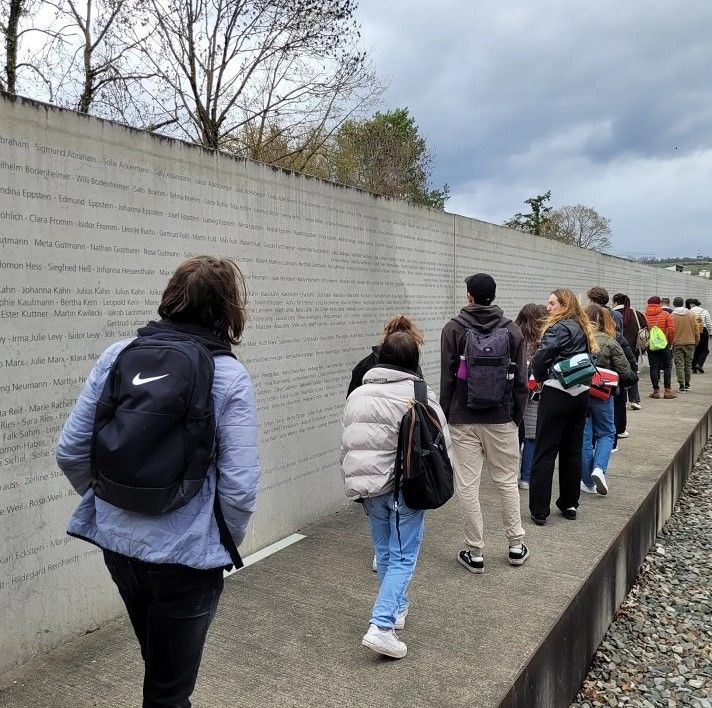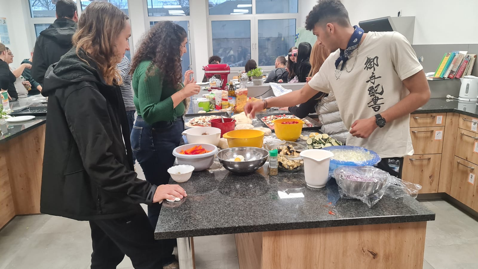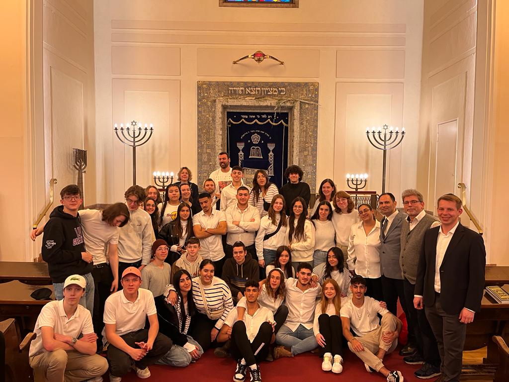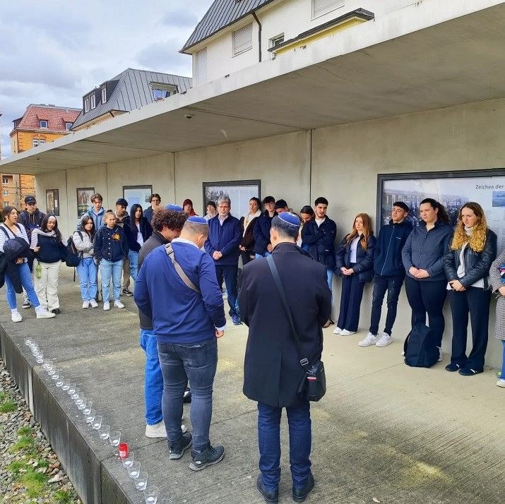 Projekte in der Schule, Besuche und Besichtigungen in Stuttgart, Ludwigsburg, Waldenbuch und im Europa-Park standen auf dem Programm. Auf der Stuttgart-Tour standen neben dem Besuch des Mercedes-Museums, einer Besichtigung der Innenstadt und einem Besuch des Fernsehturms zwei besondere Termine an: Die deutschen und die israelischen Schüler besuchten gemeinsam das „Zeichen der Erinnerung“ am Nordbahnhof, dem Ort der Deportation von 2600 Juden aus der Region Stuttgart von 1941 bis 1945 in die Konzentrations- und Vernichtungslager. Dass 80 Jahre nach diesen schrecklichen Ereignissen israelische und deutsche Jugendliche Hand in Hand gedenken, singen und das Totengebet (Kaddisch) sprechen, war ein sehr berührender Moment. Dass unsere Schulpartnerschaft angesichts der deutschen Geschichte ganz besonderen Sinn macht, zeigte dieser Moment genauso wie der anschließende Besuch in der Stuttgarter Synagoge. Dort nahmen die Schülerinnen und Schüler am Gottesdienst zur Einleitung des Sabbat (Kiddusch) teil. Dass war nicht nur für die deutschen Teilnehmenden eine Ersterfahrung, sondern auch für die Gäste aus Kiryat Shmona, die von zu Hause die sephardische Gottesdienstform gewöhnt sind und hier die aschkenasische erlebten.